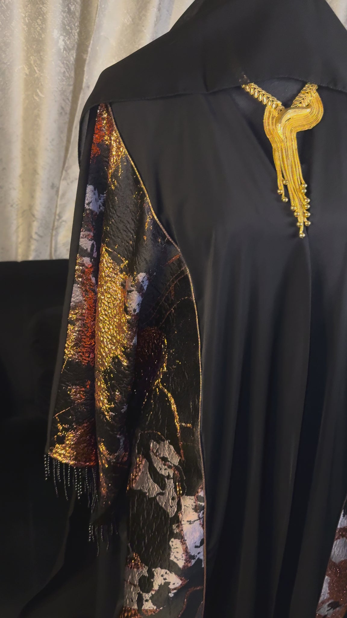 This exquisite abaya features a striking black and gold color combination, making it a truly unique and luxurious piece. The attention to detail and craftsmanship of this abaya make it a timeless and versatile piece that can be worn for years to come. The flowing silhouette and delicate embellishments on this abaya create a stunning and regal look. With its luxurious and opulent design, this abaya is a true reflection of elegance and sophistication, making it a must-have addition to any fashion-forward wardrobe.